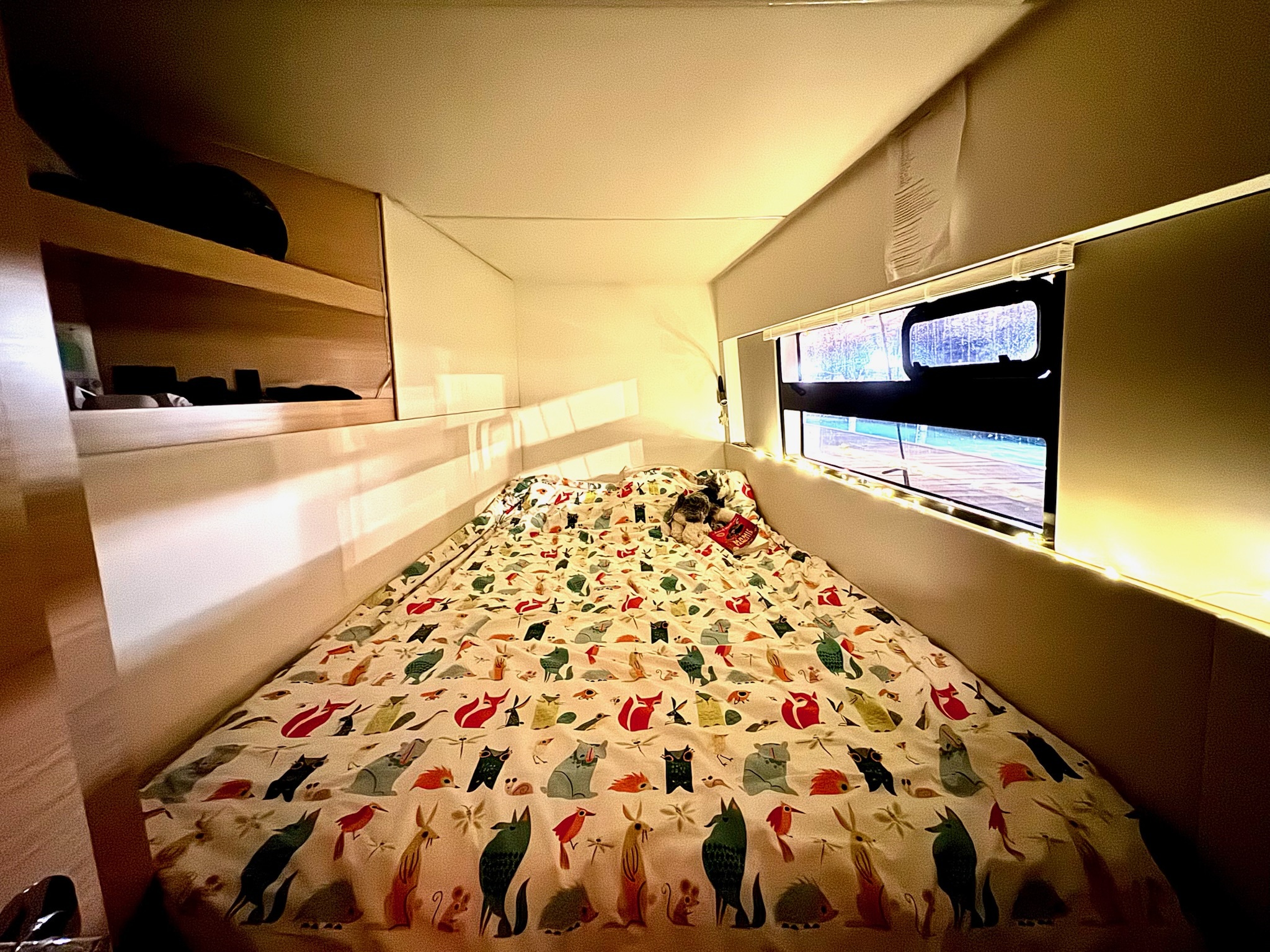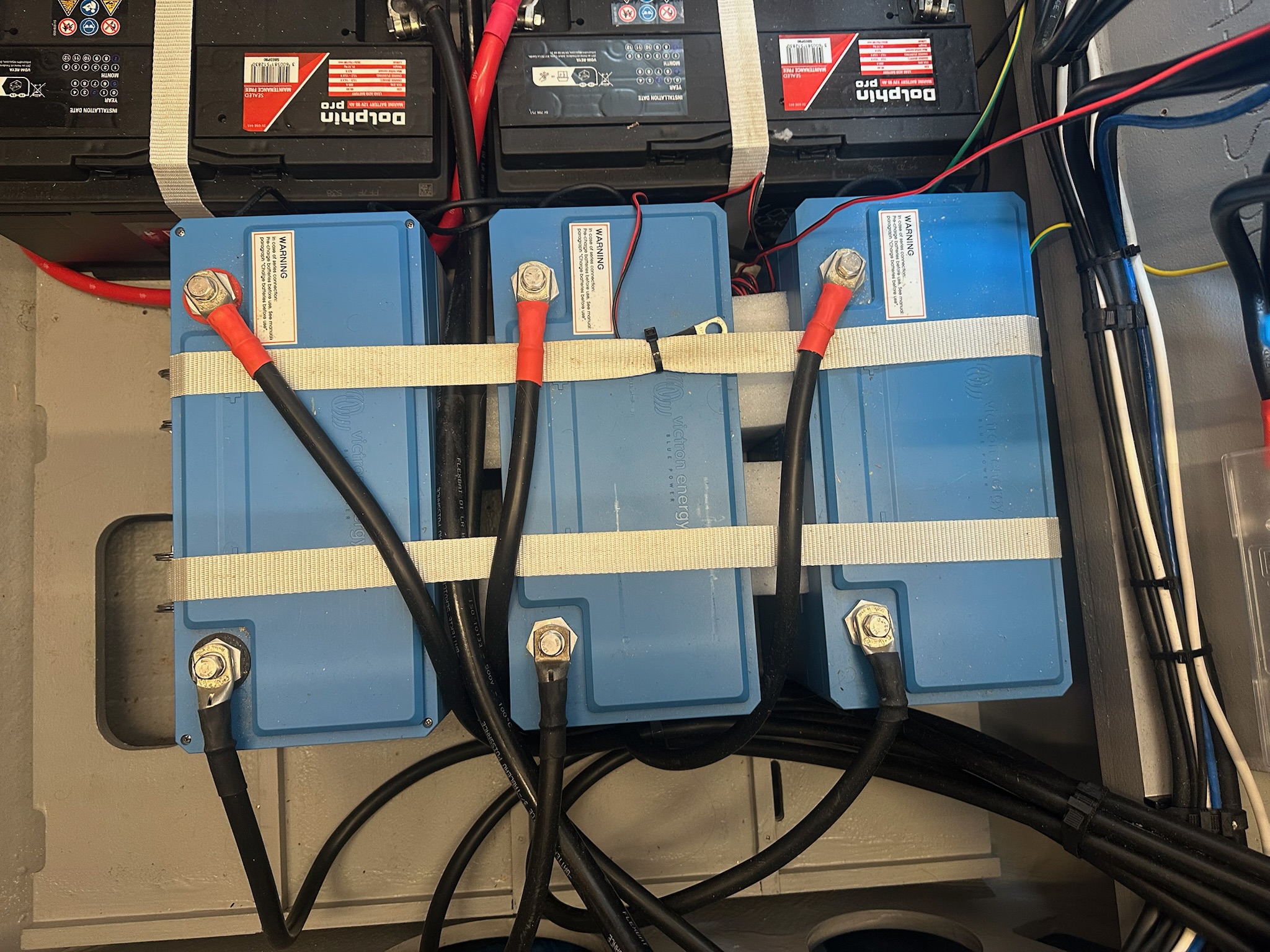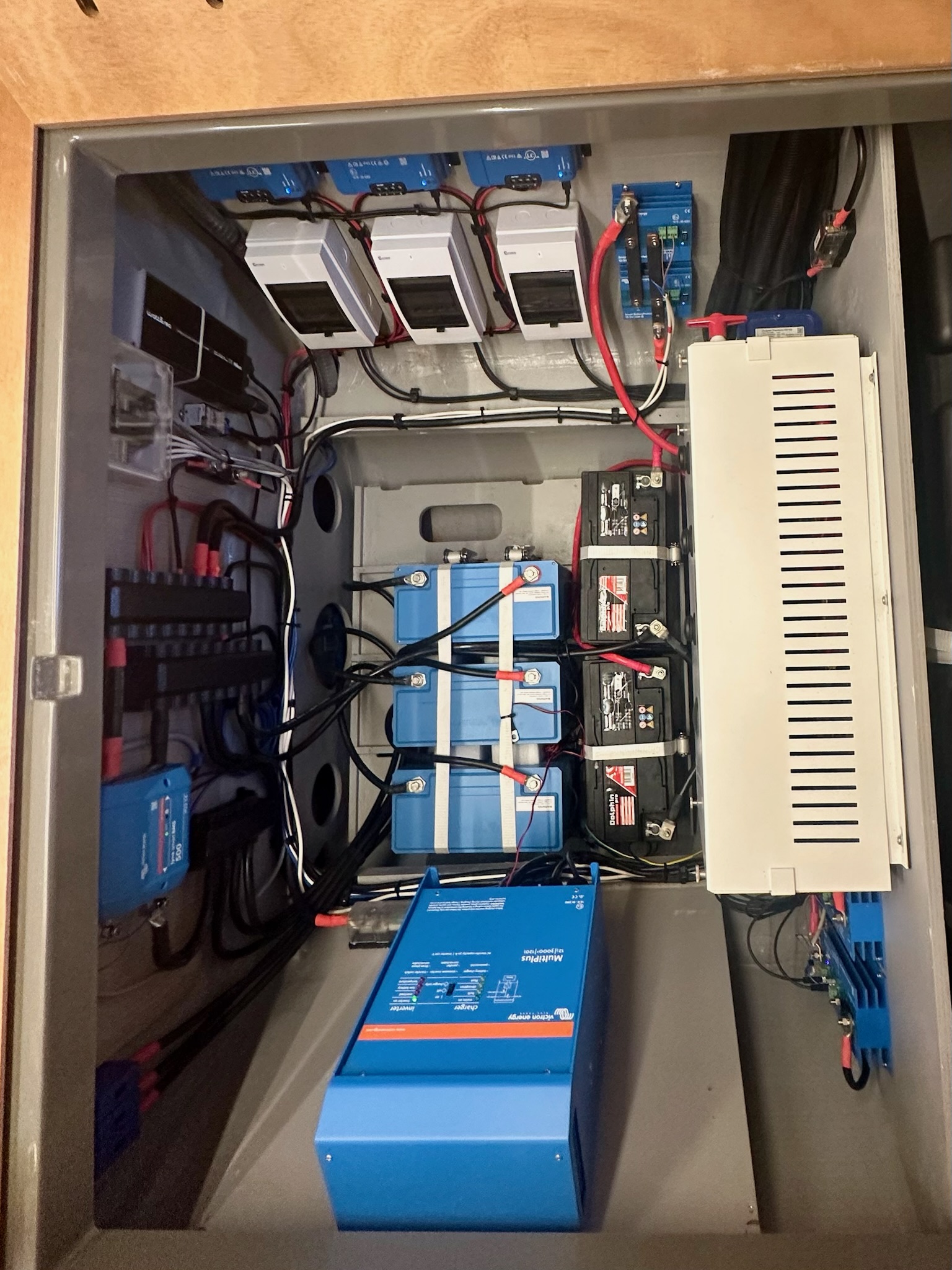 - 1200W solar panels (3 x 400W SunPower mounted on a custom arch) and 3 Victron Smart LifePO4 lithium batteries (200Ah) for sustainable energy.
